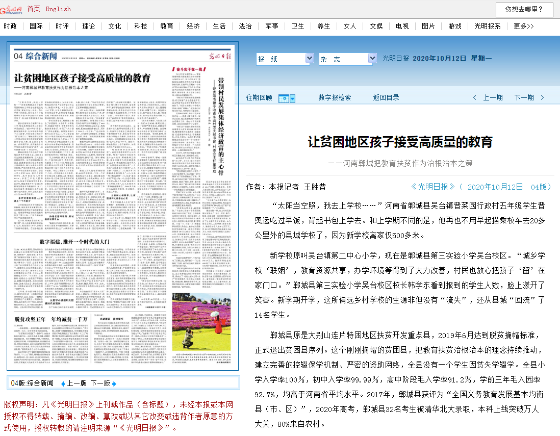 今天(2020年10月12日)出版的《光明日报》综合新闻版,以头条显著位置刊登《让贫困地区孩子接受高质量的教育——河南郸城把教育扶贫作为治根治本之策》,对郸城教育成果进行了详细而深入的报道,这里全文转载,以飨读者——