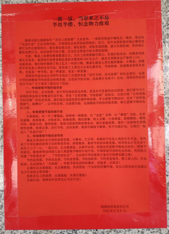 “节约粮食必须从我们自己做起,从身边的人做起,更要从小事做起”。该公司职工纷纷表示,勤俭不是吃苦,“光盘”是节约,是习惯,是一种品质,更是对党中央号召反对浪费的响应,对国网“三节约”精神的认真诠释和体现!