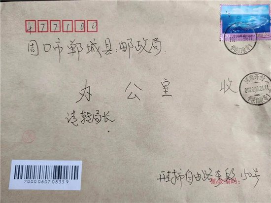 事后,丁阿姨特意写来感谢信。“我与老伴前往田楼,朱师傅一路微信联系、关照、关心,又开车接我们,将我们送到王大哥家。快50年了,郸城变得认不出了,丁村和田楼,道路变化也大,房东的家已不在东头,而变成西头了。如果不是朱俊清师傅帮助,天知道,我们俩个七十多岁、白发苍苍的老人会遇到多少困难,会不会出现险情。”感谢信中,丁阿姨写到:“如果没有热心、负责、尽心、尽职的朱师傅,很可能就没有我的郸城之行。想想,七十多岁的老人寻找八九十岁的亲人,就不会那么容易。感谢邮政培养了这么好的邮递员!”