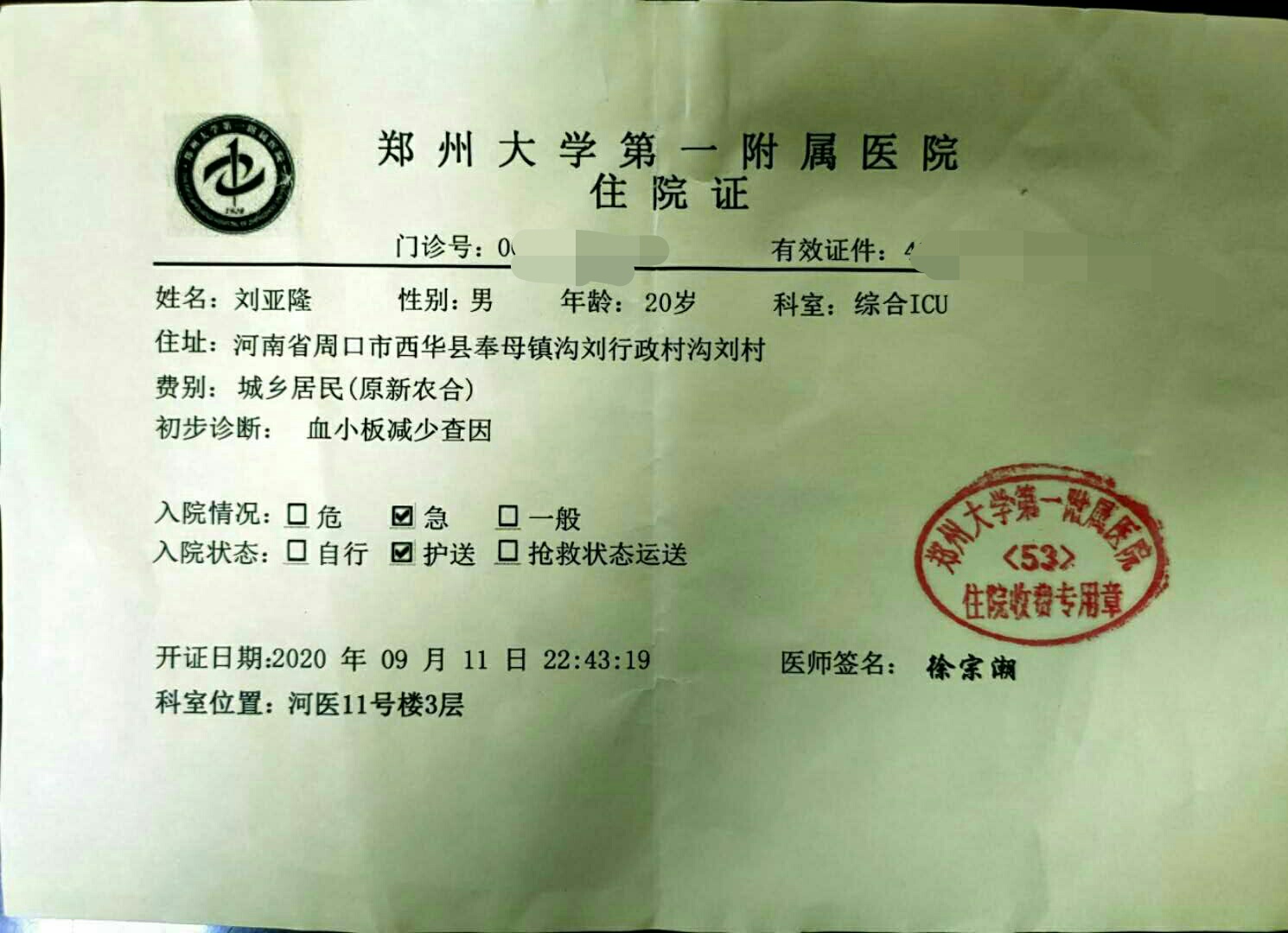 “俺家亚隆今年才20岁,在郸城一高复读一年考了653分,考上‘双一流’。本来开开心心的,到9月份要开学了发现他身上有出血点,牙龈还红肿,就带他去漯河检查。开始说是肝上的毛病,查肝的时候发现血小板特别低,赶紧转到郑州,9月15号确诊为白血病。还有四天就要上大学了,现在只能申请推迟一年入学。“亚隆妈妈告诉记者。