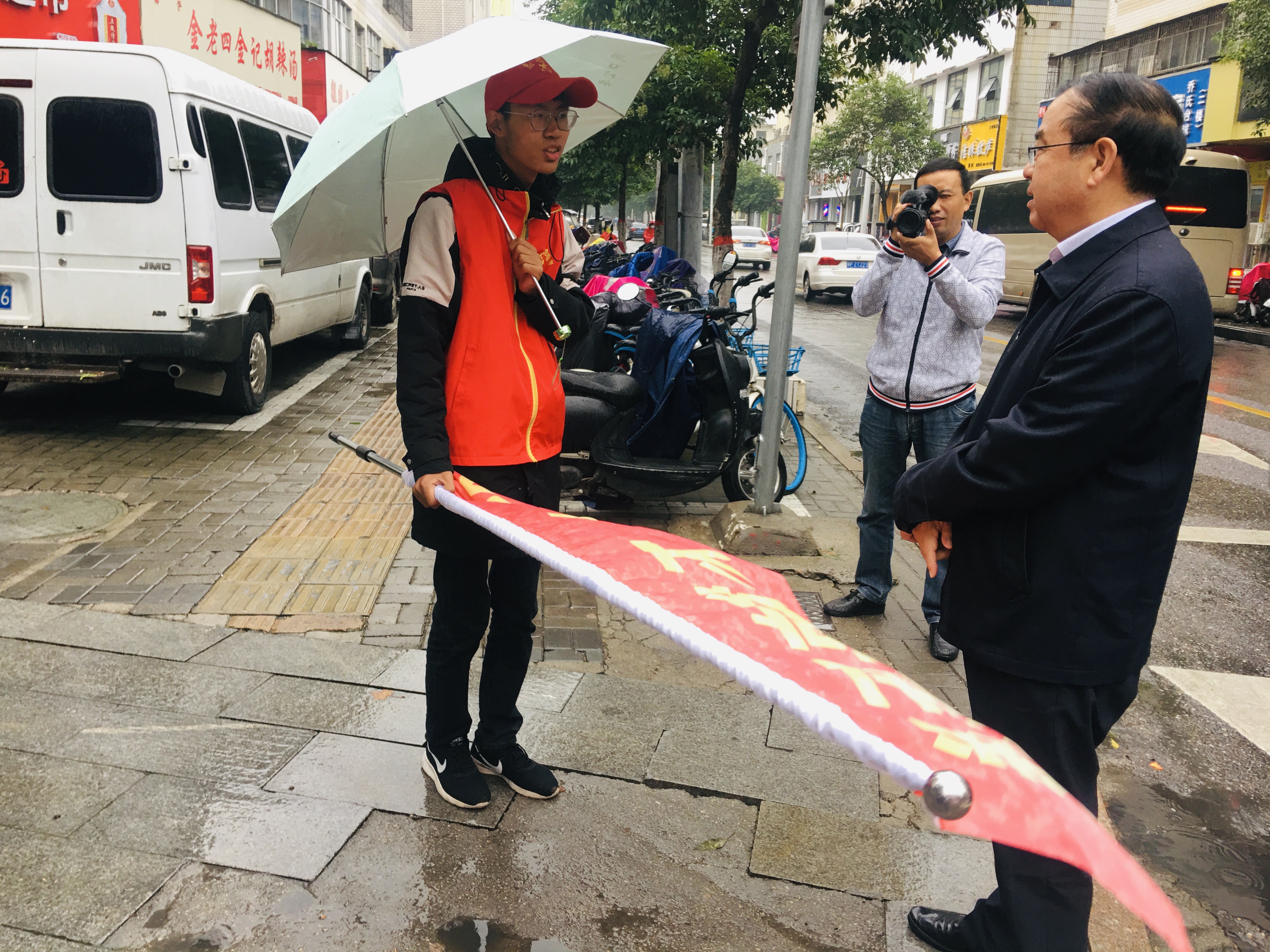 在文明路,刘国连由北向南随机抽查分包单位工作人员和志愿者在岗情况,履职“路长制”职责。当看到工作人员和志愿者在雨中或疏导交通或打扫卫生时,刘国连对他们认真负责的工作态度进行表扬,对他们为“创文”工作作出的贡献表达敬意。他说,现在是“创文”决战决胜最后冲刺的关键时刻,希望大家继续发扬奉献精神,发挥好志愿者的作用,为“创文”作出新的贡献。①9