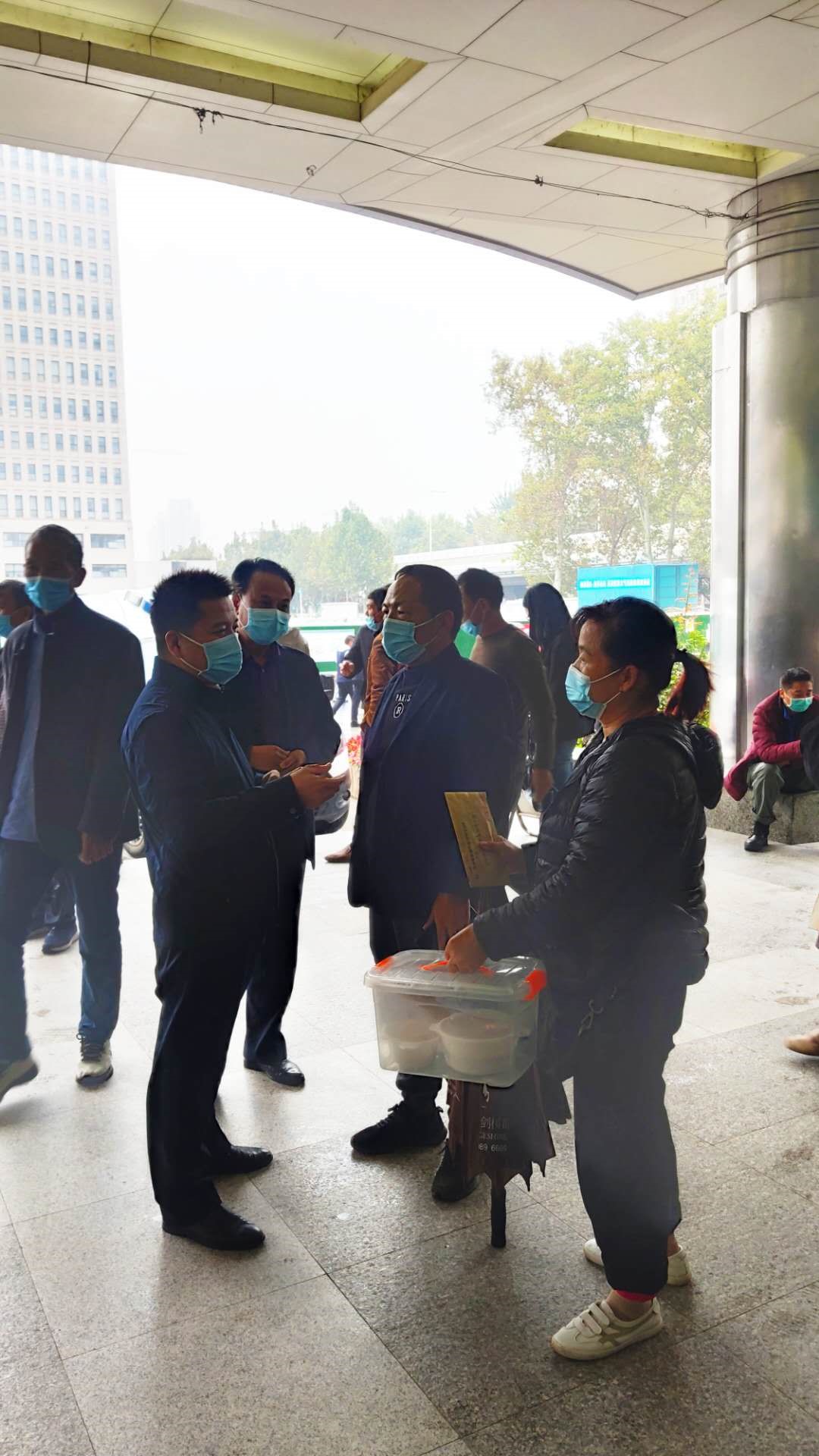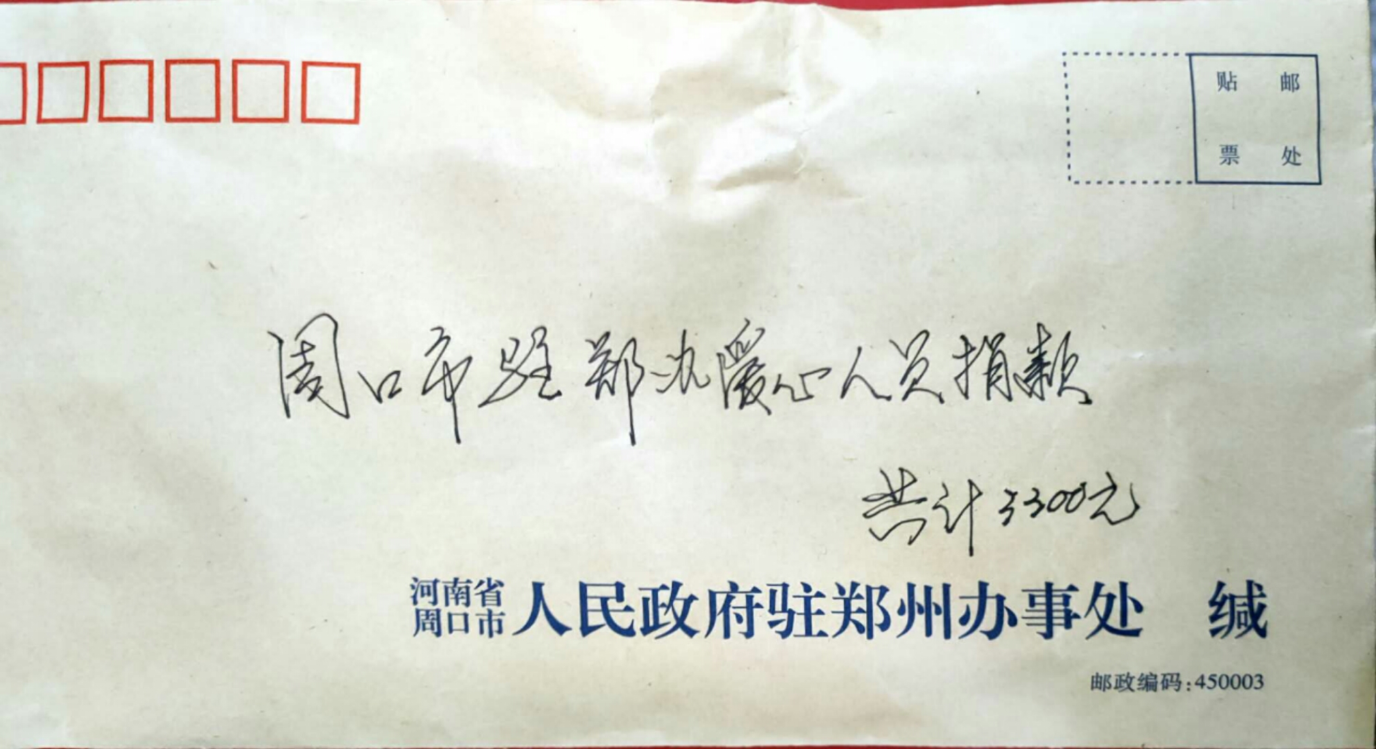 (周口市驻郑办职工在郑大一附院,把捐款交到刘亚隆父亲手中)