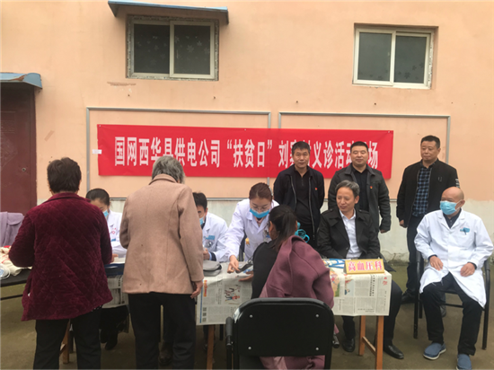 在全国第七个扶贫日来临之际,为推动精准扶贫工作的深入开展,10月15日,国网西华县供电公司总经理窦修峰、副总经理南长喜带领发展建设党支部书记杨磊、县人民医院医护人员一行到帮扶点刘寨村开展义诊活动。