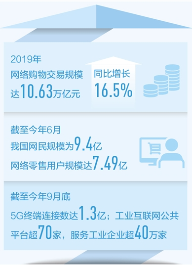 截至2020年6月,我国网民规模为9.4亿,网络零售用户规模达7.49亿。2019年网络购物交易规模达10.63万亿元,同比增长16.5%。截至今年9月底,5G终端连接数达到1.3亿;制造业数字化转型稳步前进,工业互联网公共平台超过70家,服务的工业企业超过40万家……如今,数字经济蓬勃发展,成为经济发展的新增长点,产业数字化与数字产业化的基础更加坚实,不断为高质量发展注入新动能。