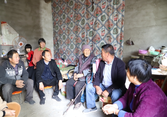 (图为郑德民和村干部一起为92岁特困供养老人孙友芝建设的两间房屋)