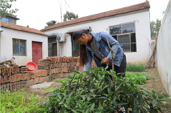 同是瓜赵村危房改造户,19岁的赵明明正在院里洒水、摘菜,小院不大,东部菜园、西部通道,井井有条,油麦菜、菠菜、小青菜、辣椒、葱、香菜、空心菜、梅豆角……五彩蔬菜给这个农家小院平添了几分温馨和生机。