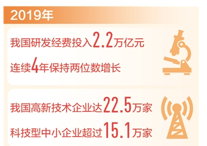 ——创新要素支撑更加坚实。2019年,我国研发经费投入2.2万亿元,连续4年保持两位数增长,总量位居世界第二位。“在经济下行压力持续加大的背景下,研发经费仍然实现稳步增长且投入强度再创历史新高,实属不易。”国务院发展研究中心创新发展研究部研究室副主任龙海波表示。创新的另一要素人才优势同样突出,2019年,我国研发人员全时当量达到461万人年,连续多年位居世界首位。