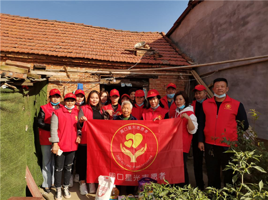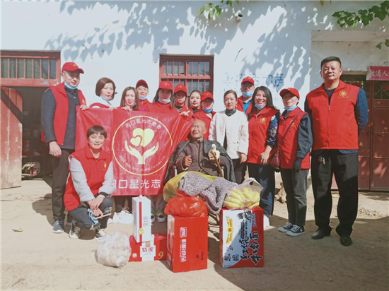 10月25日,九九重阳节,周口星光志愿者协会的志愿者到川汇区孙嘴村、西华县大王庄乡等地,亲切看望慰问赵凤英、李爱莲、李遵理等孤寡老人,为他们送去节日的祝福和慰问品,并为老人穿上捐献的棉衣,和老人嘘寒问暖拉家常。