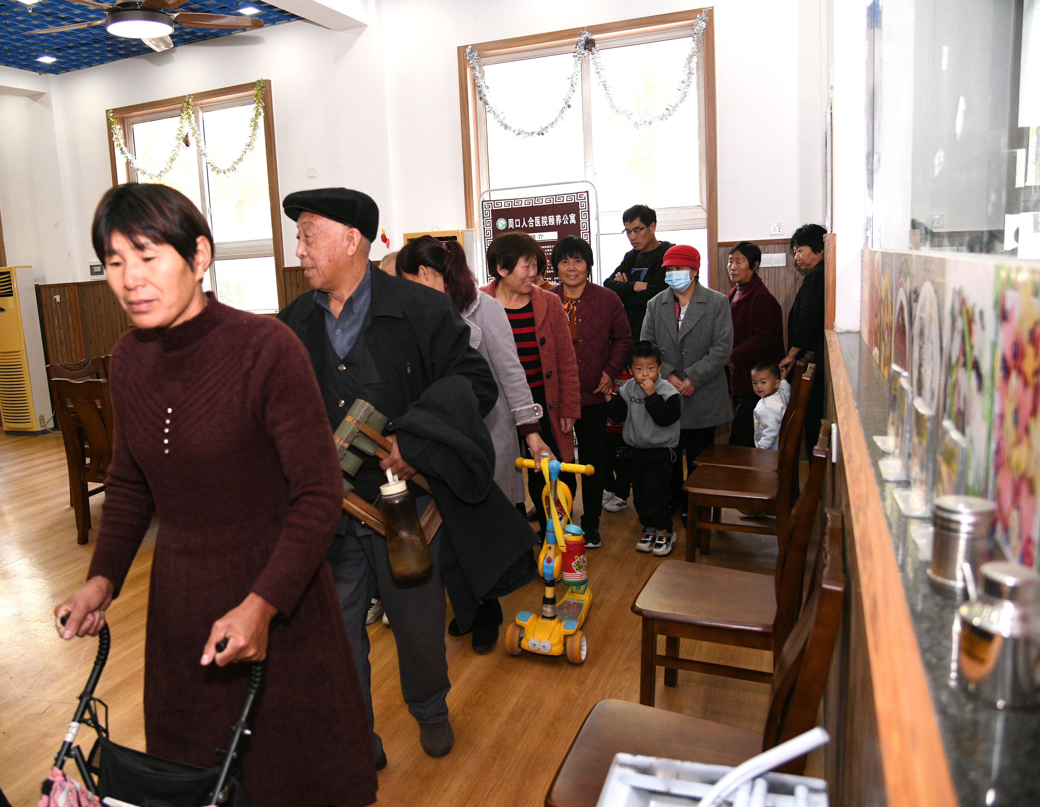 10月25 日,商水人合颐养公寓大红的爱老敬老的条幅如彩带纷披,挂着院内,像过年一样的喜庆。老年人穿戴喜庆,服务人员早早地起床,帮助老人起床、准备好早点、收拾好房间、检查老人是否按时吃药。早点的花样很多,厨房换着法儿给老人改善饮食,等老人收拾停当,服务人员推着饭车,将饭送到老人的房间。
