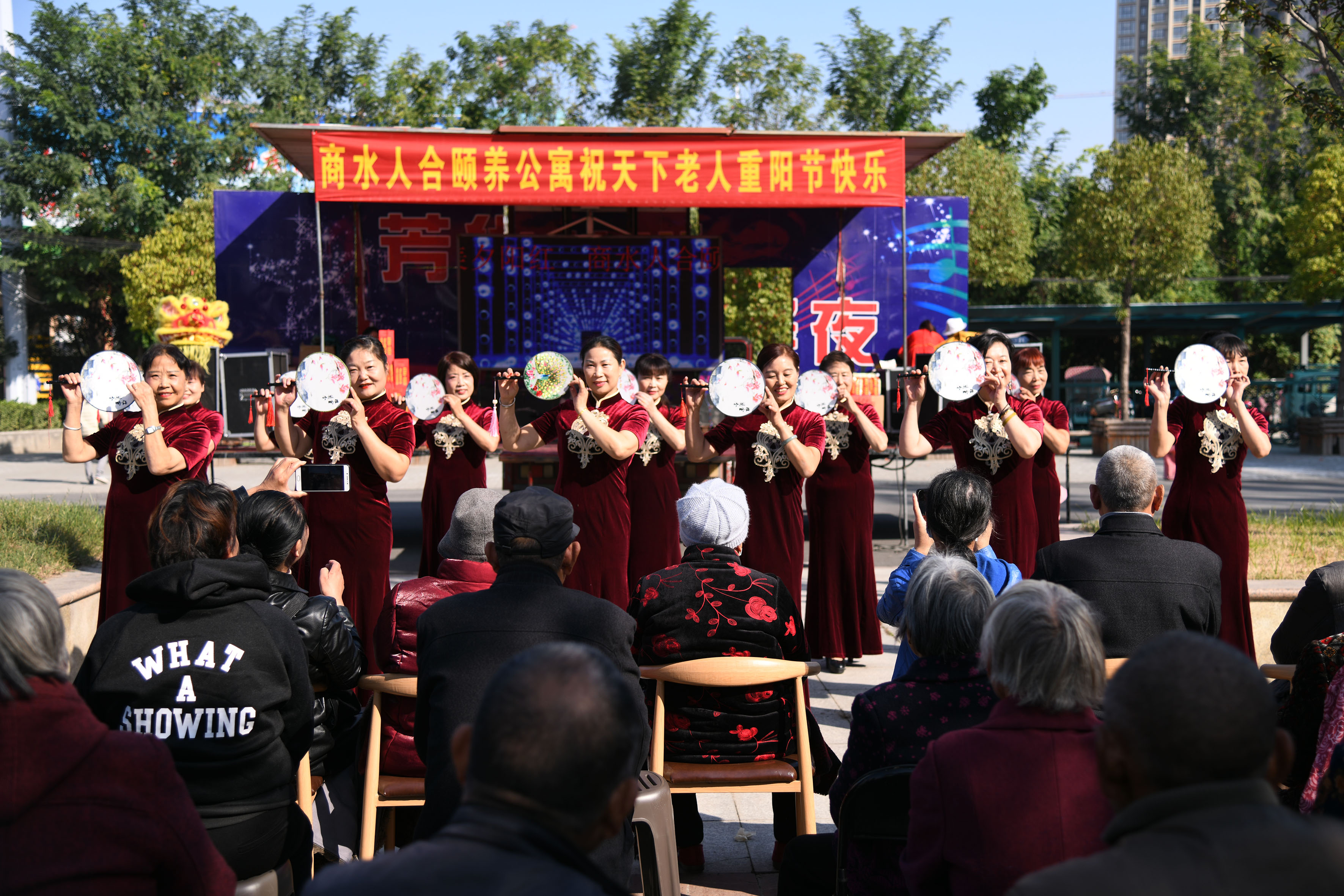 公寓外搭起戏台,商水人合颐养公寓在重阳节里给喜爱听戏的老人准备了一台大戏。老人吃过早点,准备停当之际,公寓外的大戏鸣锣响起。老人们在服务人员的侍候下,来到院内,坐下来听戏。让老人们兴奋的是听戏的观众里有很多是不认识的老姐妹,经打听才知道她们是附近社区的老姐妹儿。她们重阳节里来人合公寓不仅仅是听戏,还听说公寓里条件好、服务好、娱乐多,是老年人值得托付养老的好地方,很多人结伴前来探个究竟。