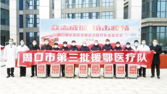 2月13日,该院经领导班子研究决定,拟筹备周口港区医院(周口烧伤医院)增援武汉医疗队,为随时增援武汉做准备。2月14日,该院召开了增援武汉医疗队动员会,各科室负责人及预报名的同事40余人参会。最终在报名的40余位医护人员中抽调贺志勇、尹东云等8位精兵强将,由院长贺志勇亲自带队,每日进行针对性的专业培训,为随时增援武汉做准备。3月3日上午,周口市第三批援鄂医疗队暨周口港区医院(周口烧伤医院)支援武汉医疗队出征仪式,在周口港区医院(周口烧伤医院)举行。市政府副市长秦胜军、港区管委会主任程若光等出席仪式并为医疗队送行。3月3日晚7时许,周口港区医院(周口烧伤医院)援鄂医疗队抵达对口支援的武汉商职医院,3月4日正式开始医疗支援工作。从3月3日至4月1日共29天里,他们累计收治117名新冠肺炎患者,其中包括2名危重症患者、28名重症患者和4名失能患者,并实现了医务人员零感染、患者零死亡、零投诉的“三零”战绩。