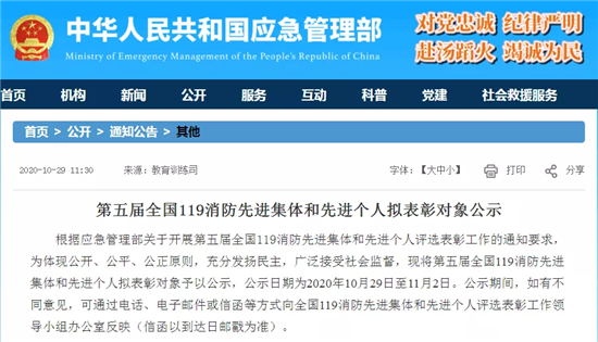此次评选表彰工作坚持公开、公平、公正的原则,按照自下而上、逐级推荐、民主择优的方式进行,11月2日公示结束。据悉,这是首次将新组建的国家综合性消防救援队伍及其指战员纳入该奖项评选表彰范围。