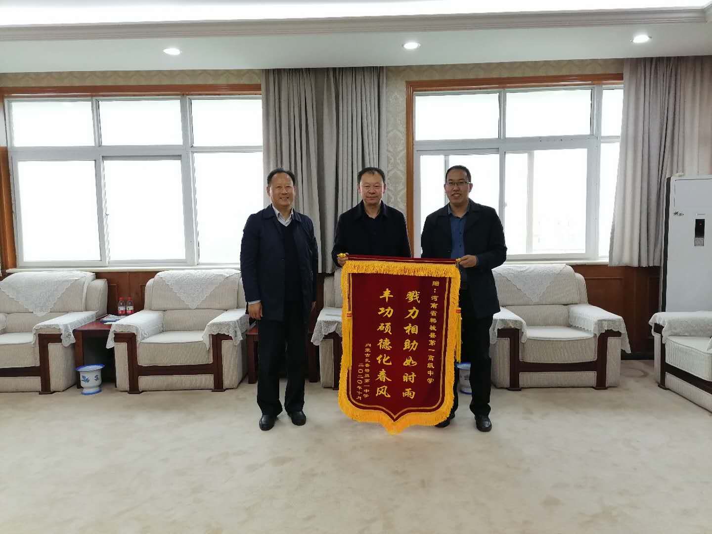近日,内蒙古自治区通辽市扎鲁特旗第一中学校长刘思超为感谢郸城一高,特意从1700多公里外赶来,赠送一面“丰功硕德化春风 戮力相助如时雨”锦旗。郸城县政府督学王平崇参加赠送仪式。