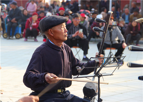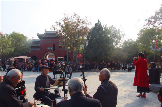 11月10日,戏迷朋友在商水县郝岗镇北社村千年古塔旁表演戏曲节目。初冬时节,暖阳普照,寿圣寺古塔附近的戏迷和乐器爱好者自发来到千年古塔旁表演戏曲节目,为当地群众送上精彩的文化大餐,进一步活跃了农村文化生活。①15周口日报·周道客户端记者付永奇 通讯员 吕耀光 摄