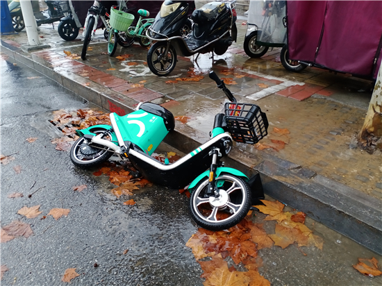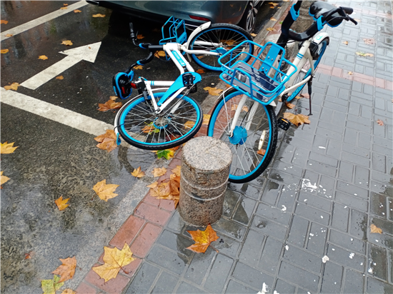11月18日上午,记者在周口中心城区育新街和建安路上看到,一些共享单车被随意放在路边,造成一定交通隐患。①15