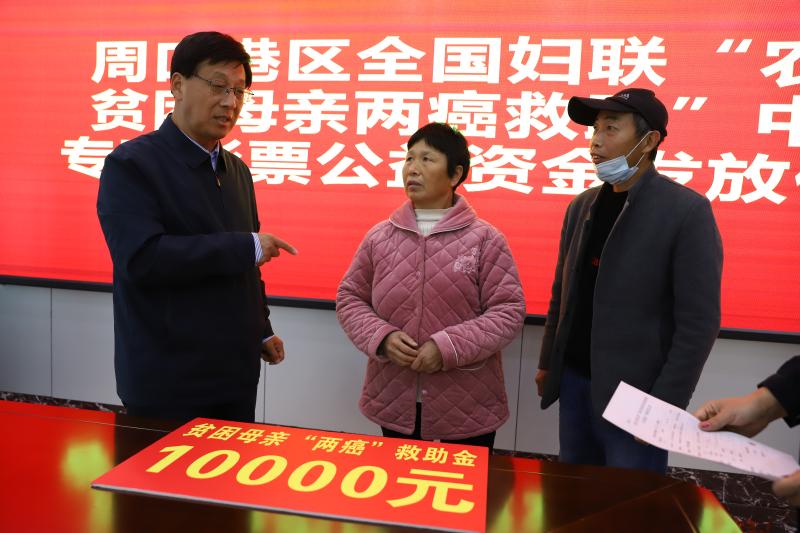 11月19日上午,周口港区妇联举行全国妇联“农村贫困母亲两癌救助”中央专项彩票公益金资金发放仪式,向受到救助的李埠口乡苑老村的“两癌”贫困母亲李贵平发放救助金1万元。周口港区党委委员张东立、港区妇联副主席刘影及相关工作人员参加了发放仪式。