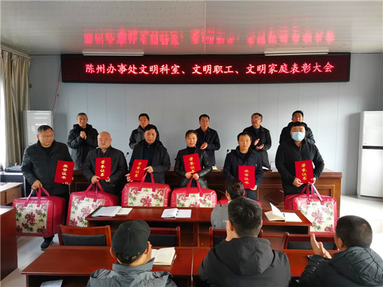 疫情防控办公室、党政办公室获得“文明科室”称号;王志国、史路路获得“文明职工”称号;邹亮家庭、武志强家庭等6个家庭获得“文明家庭”称号。大会为获奖集体和个人颁发了奖牌、荣誉证书和奖品。取得荣誉的先进集体和个人,集中展示了陈州办事处的文明形象和干部职工的职业道德、家庭美德和个人品德,为文明单位创建增添光彩。