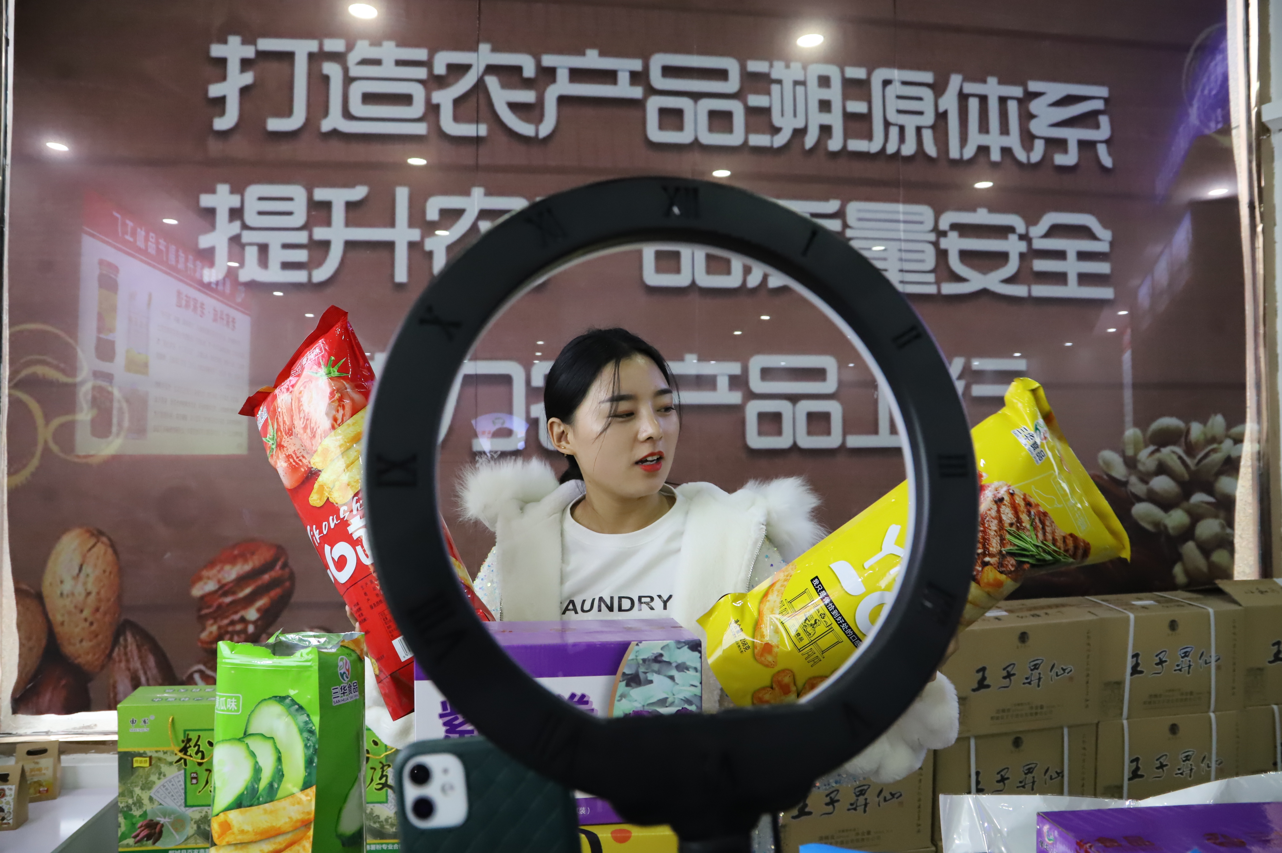 “我手上拿的是郸城特产,薯条、粉条、烤鸭蛋、麻花……我们网红产品有一个共同的名字——‘老家丹成’公共商标。”郸城县是财政部、商务部、国务院扶贫办综合司联合命名的第五批“国家电子商务进农村综合示范县”之一。11月30日,在郸城县电子商务服务中心,网红正在直播中,3分钟接到7个订单。近年来,该县在县城打造电商公共服务中心,培训县乡村各级电商人数达到8160人次,活跃在一线的网红越来越多,全县通过电商销售收入突破10亿元。“老家丹成”公共品牌,包含豫树食品、浩丹香油、面粉、豫京园香油、李记红薯、文玉食品、华星调味品等产品,孵化80余家上行店铺,让郸城县农副特产品利用公共品牌提高附加值,将有机面粉、小麦、红薯、粉丝、黑皮冬瓜、山药、面皮、辣椒酱、香油等本县特产销往全国,从而带动贫困户脱贫致富。