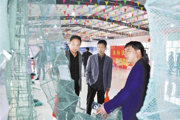 商水县练集镇按照“一镇一主业”要求,在中杨庄村设立镇工业园区,在各村设立扶贫车间,大力发展渔网编织业,全力打造我省最大的渔网小镇。图为外地客商在练集镇渔网展厅选购产品。记者 付永奇 摄