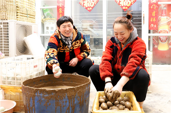 这一下子让娘儿俩忙得不可开交,全家总动员沿河收购鸭蛋,雇佣工人帮助烤鸭蛋,采购扶贫种植基地种植的荷叶、艾叶等,随着烤鸭蛋销量的提升,杨艳春也成为郸城县脱贫攻坚战线的一名功臣。