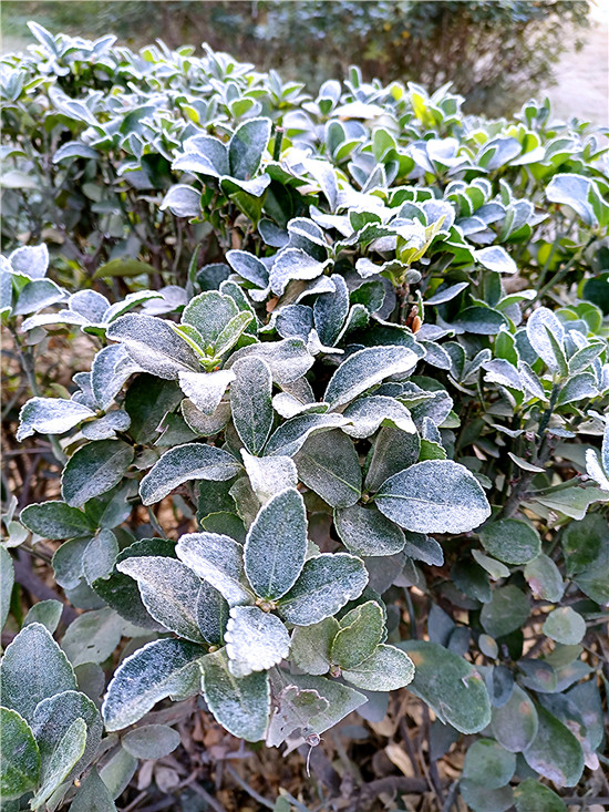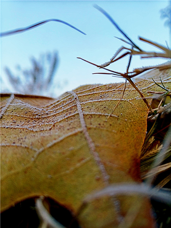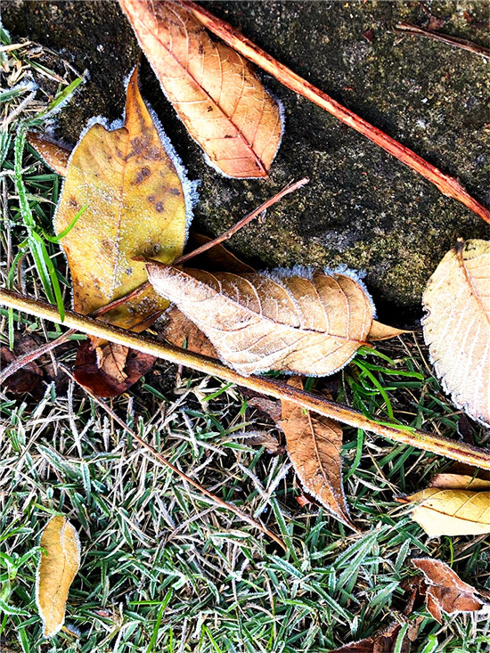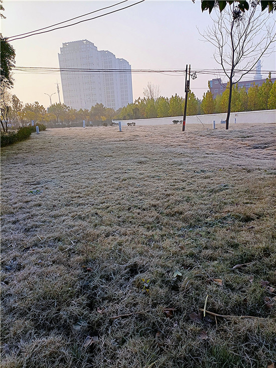 百草今何妆?茫茫著华霜。寒烟锁素艳,疾步量路长。12月4日早晨,我市下霜了,洁白的华霜就像一层薄纱,在阳光的映照下分外美丽。