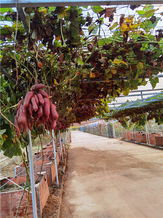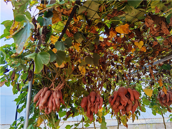 西华县农科所积极开展“空中结薯”试验种植研究,并取得成功。“空中结薯”采取嫁接技术,选用旋花科植物牵牛作砧木,脱毒薯苗作接穗嫁接而成,嫁接成活后栽到土壤里,搭建棚子,加强薯苗水肥管理,每株插一根小竹木杆,促进薯苗快速生长上棚,在棚上吊花盆,盆内放蛭石,生长到掤上的薯秧压到花盆里,加强水肥管理。90天结薯,进入10月份把花盆去掉。该技术打破传统栽培方式,主要为公园、科技园区、农业生态观光园、家庭庭院内培植,有很好的科研价值、观赏价值和农业推广价值。周口日报·周道客户端记者李凤霞 摄