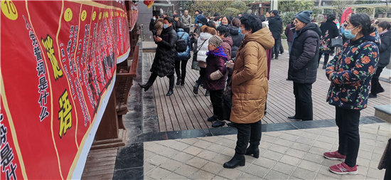 一大早,来自川汇区文联、区民协的工作人员,将金色东方社区的休闲广场装扮得格外喜庆,两条带有传统纹饰图案的喷绘印着谜语和党的知识,挂在休闲长廊上,吸引着出来晒太阳或散步的居民。区文联党组书记史涛,区文联党组成员、副主席游富华,区人和办事处副书记武阳,市民协副主席罗营东、区民协主席杜超,区民协秘书长任建明等走进社区,参加这场活动。“中国共产党是什么时候成立的?”“1921年7月23日”“答对了,奖洗衣液一壶!”游富华以问答的形式和居民们互动,向居民们普及党的知识,居民们纷纷参与,气氛活跃。