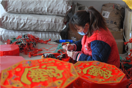 12月14日,记者在一帆工艺制作工厂内看到,二十多名村民在各自的工作岗位上有条不紊地忙碌着。简易焊接、测试组装、安装炮串……一串串喜庆的电子鞭炮组成装箱,贺潘海正在指挥工作人员装车,现场一派繁忙的景象。