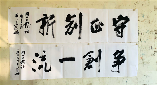 在周口日报社书画院里,王学岭与报业人畅谈故乡变化,了解周口发展,不由感慨新时代家乡的发展繁荣。随后,王学岭现场执笔泼墨、即兴挥毫,用行云流水般的丹青妙笔绘就了一幅幅良词金句,近30分钟的时间里他一气呵成,连续创作了3幅书法佳作,即“守正创新”“争创一流”“只争朝夕”,书写了对周口报业传媒集团的美好祝愿。