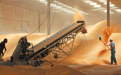 许昌市建安区陈曹乡双庙村金丰公社农业服务有限公司,工作人员在粮仓中整理刚刚入库的小麦。资料图片