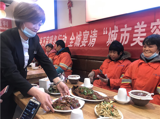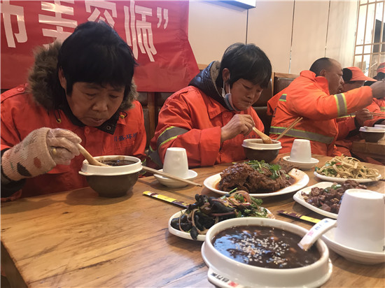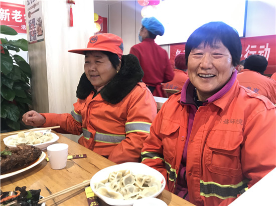 “2017年以来,谷万家多次举办这样的活动。环卫工人工作非常辛苦,无论酷暑严寒、刮风下雨,他们为创造优美整洁的环境默默付出着,在冬至这天,请环卫工人们吃顿好的,也是我们的一点心意。谷万家全体员工提前几天准备好手工包制的饺子,想让他们喝上地道八宝粥,吃到皮薄馅大的饺子,让他们感受到寒冬里的温度。”谷万家八宝粥总经理郭雪英说。②10
