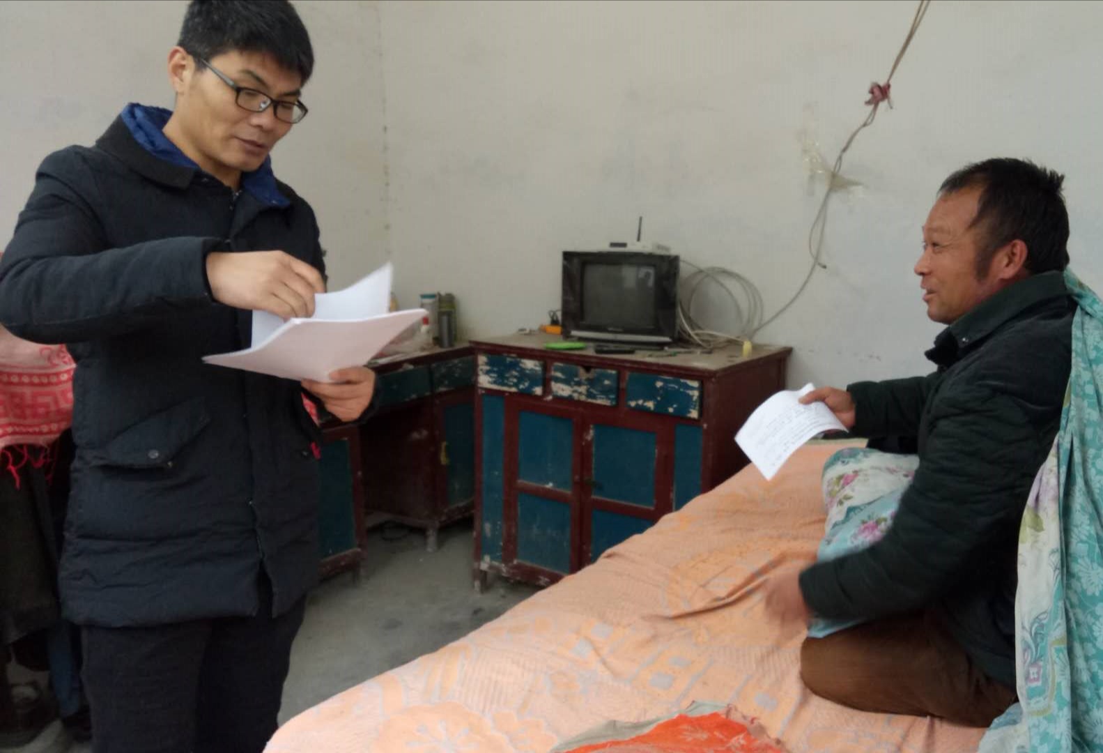 图片说明:位全峰(左)到北岭村残疾贫困户家中了解情况,讲解残疾贫困户应享受的扶贫政策。