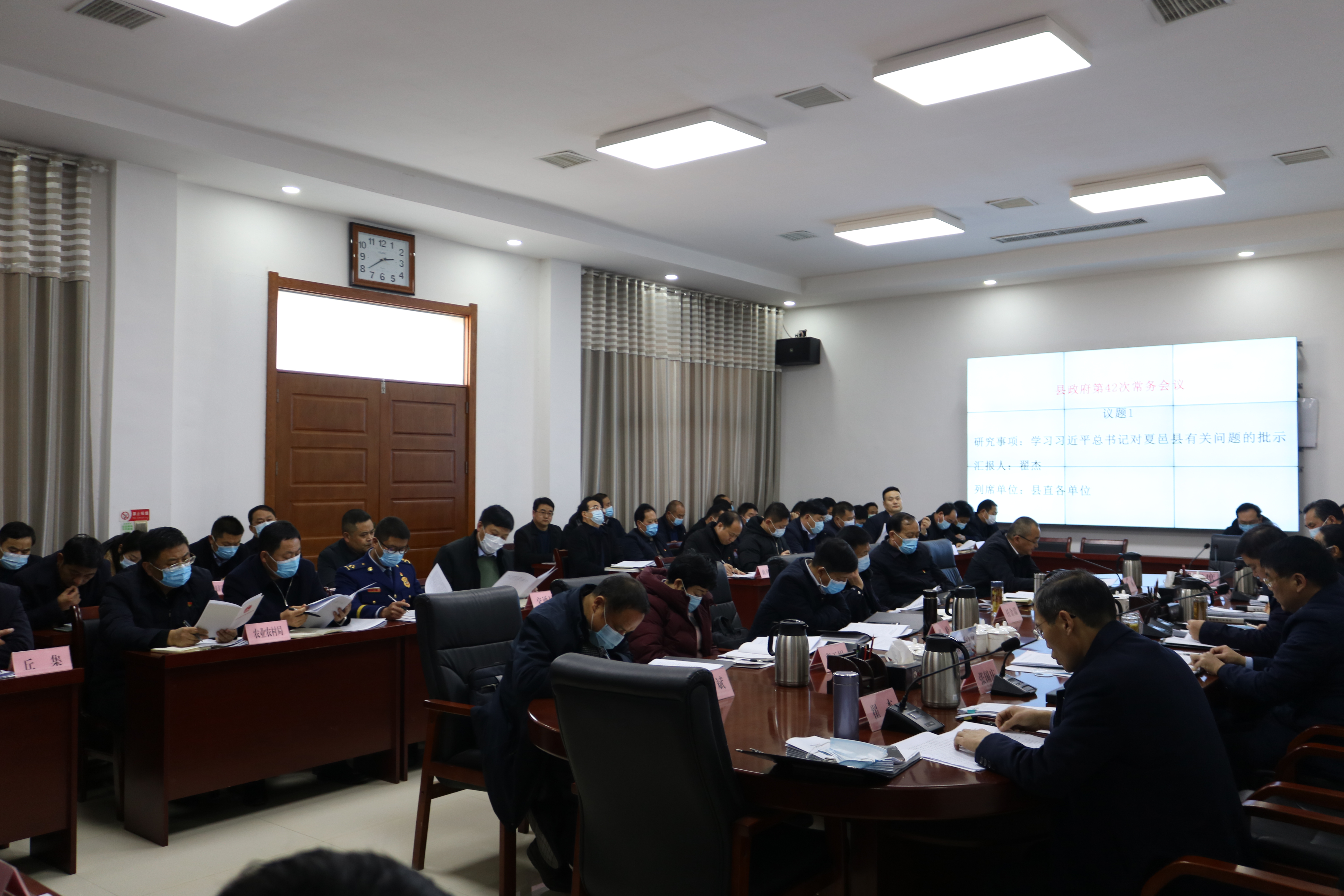 会议先后传达学习了习近平总书记对夏邑县有关问题的批示精神、中央经济工作会议精神;学习了关于我省党政代表团赴上海、江苏、浙江学习考察情况的报告以及河南省消防安全责任制实施办法;听取了关于2020年民生实事完成情况的汇报、关于政府系统落实省委巡视整改工作情况的汇报、关于鹿邑县2020年环保攻坚工作情况汇报、关于鹿邑县2020年安全生产工作情况汇报、关于鹿邑县秋冬季新冠肺炎疫情防控工作汇报、关于成立鹿邑县林业生态发展有限公司的汇报、关于引江济淮工程弃土处置问题的意见汇报。