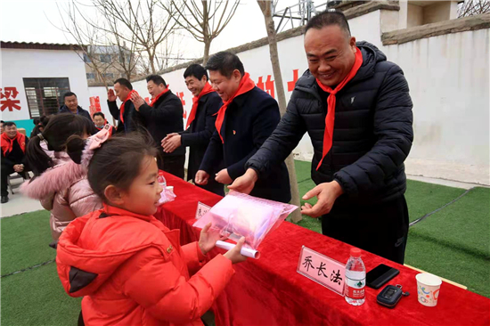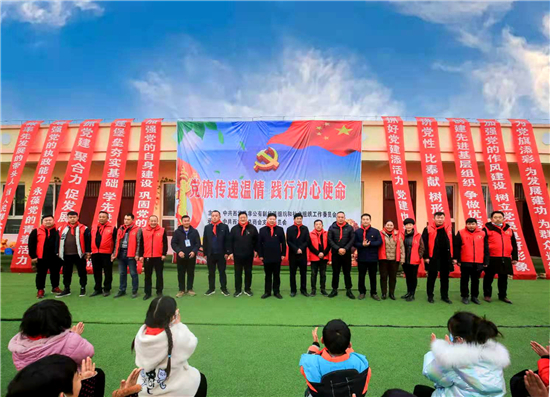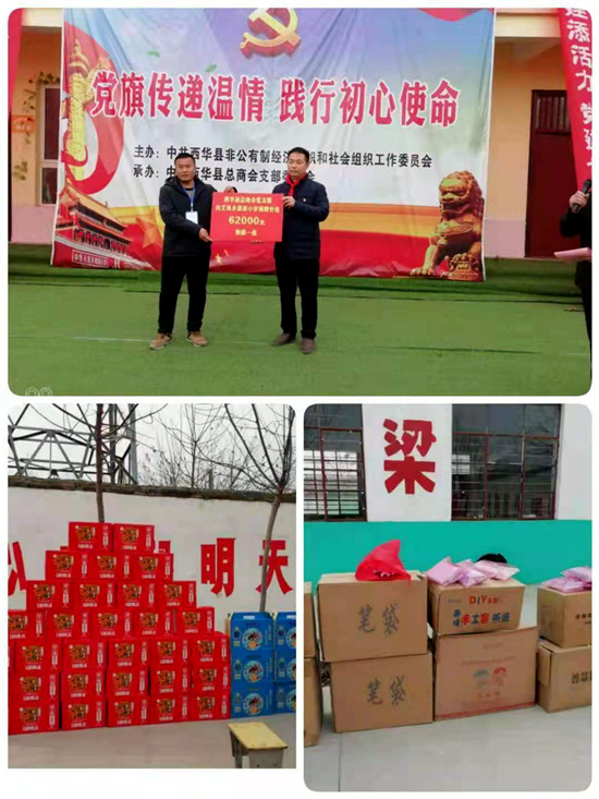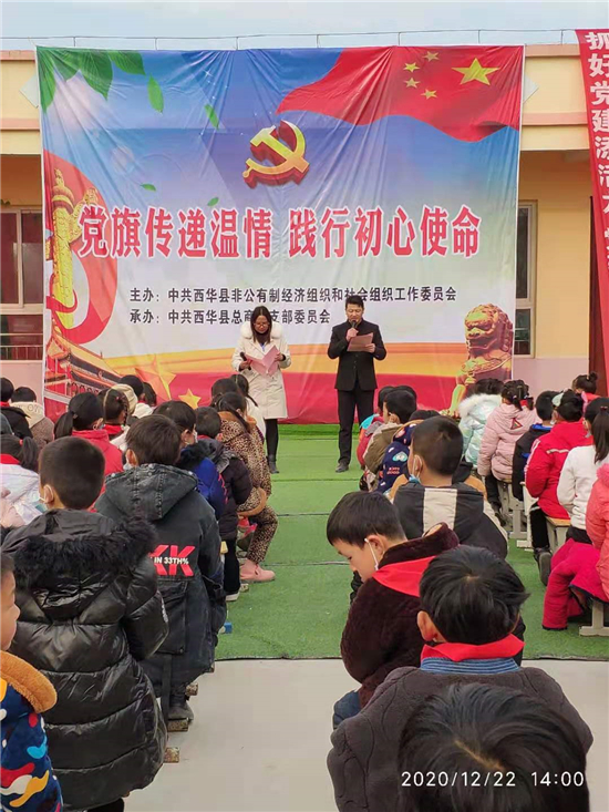 12月22日,西华县“两新”组织党工委联合县总商会党支部,在艾岗乡潘南小学开展“党旗传递温情、践行初心使命”爱心捐助活动,潘南小学全体师生及爱心企业家共计200余人参加活动。