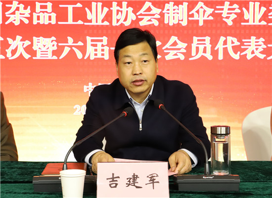 12月23日,中国日用杂品工业协会制伞专业委员会五届五次暨六届一次会员代表大会,在被誉为“中国伞业之乡”的郸城县召开。周口市委常委、常务副市长吉建军,市人大常委会副主任、郸城县委书记罗文阁,县长李全林,中国日用杂品工业协会理事长杨西京、副理事长肖卓玲、秘书长夏琳,中国日用杂品工业协会制伞专业委员会会长蔡卓燐等出席会议。来自全国各地220家制伞企业负责人和代表参加会议。
