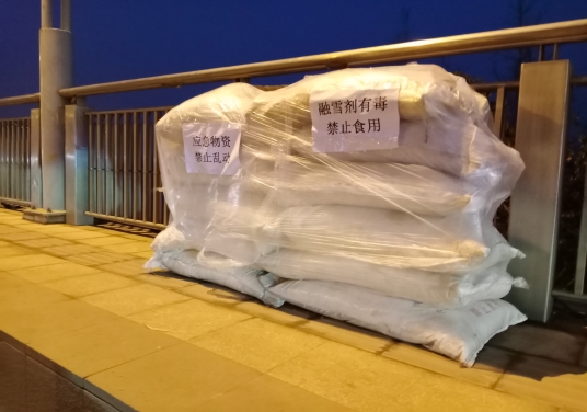 12日28日晚,记者在周口大道桥上看到,桥的两侧放置了五六堆融雪剂,以应对即将到来的雨雪天气,防止桥面结冰给车辆和行人造成不便,此举受到路过行人一致好评。