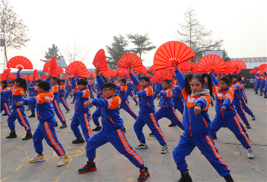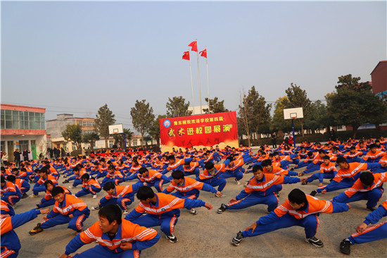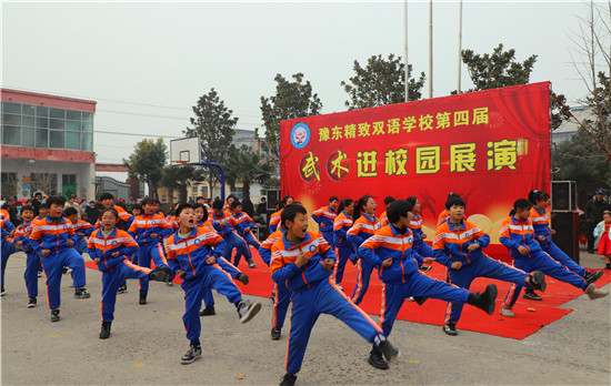 “嘿!哈!”“嘿!哈!”……12月28日,一声声铿锵有力而又充满童稚的喊声,在商水县谭庄镇豫东精致双语学校上空回荡。由该校800多名学生参加的第四届武术进校园展演活动正在举行。
