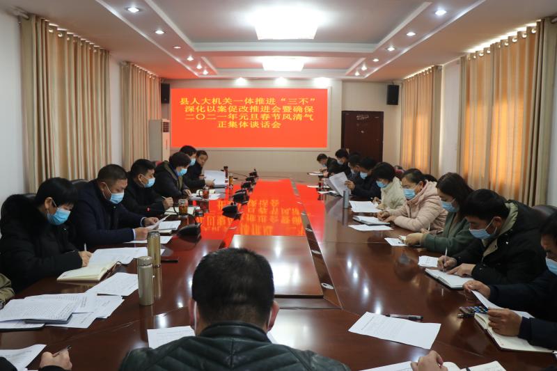 12月30日,西华县人大常委会机关召开全体人员会议,安排部署机关一体推进“三不”深化以案促改工作,进行节前廉政集体谈话。县人大常委会主任周晓燕,副主任赵晓春、王心坎、庞有敬出席会议。
