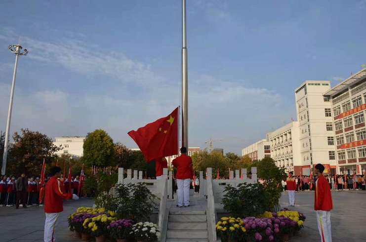 迎着朝阳,国旗护卫队队员们迈着铿锵的步伐护卫着国旗入场。激昂的《义勇军进行曲》响起,全体师生庄严肃立,向国旗行注目礼,嘹亮的歌声簇拥着国旗直冲云霄,在晨曦中迎风飘扬在二实中的上空。
