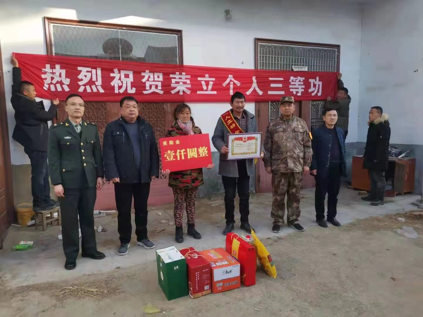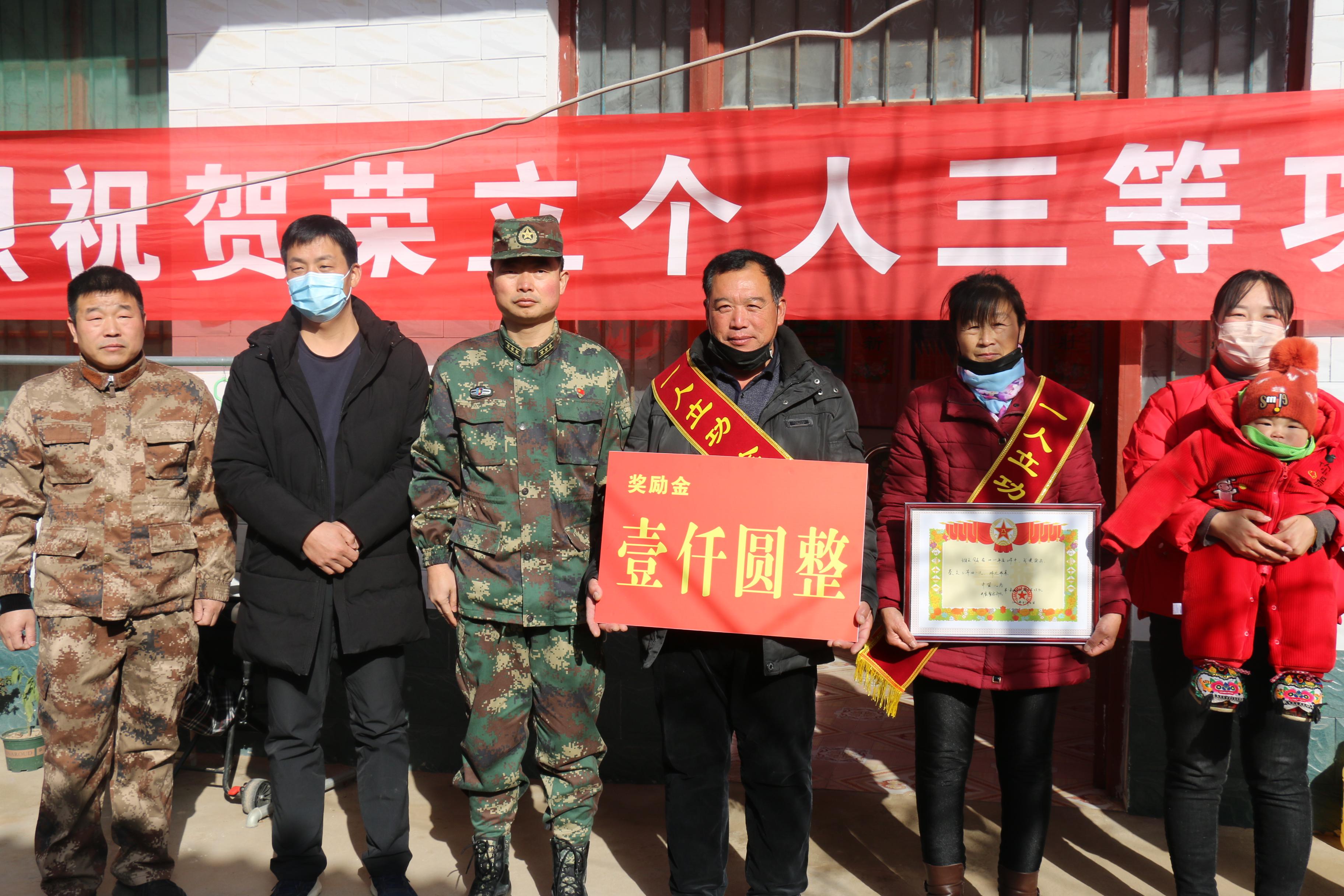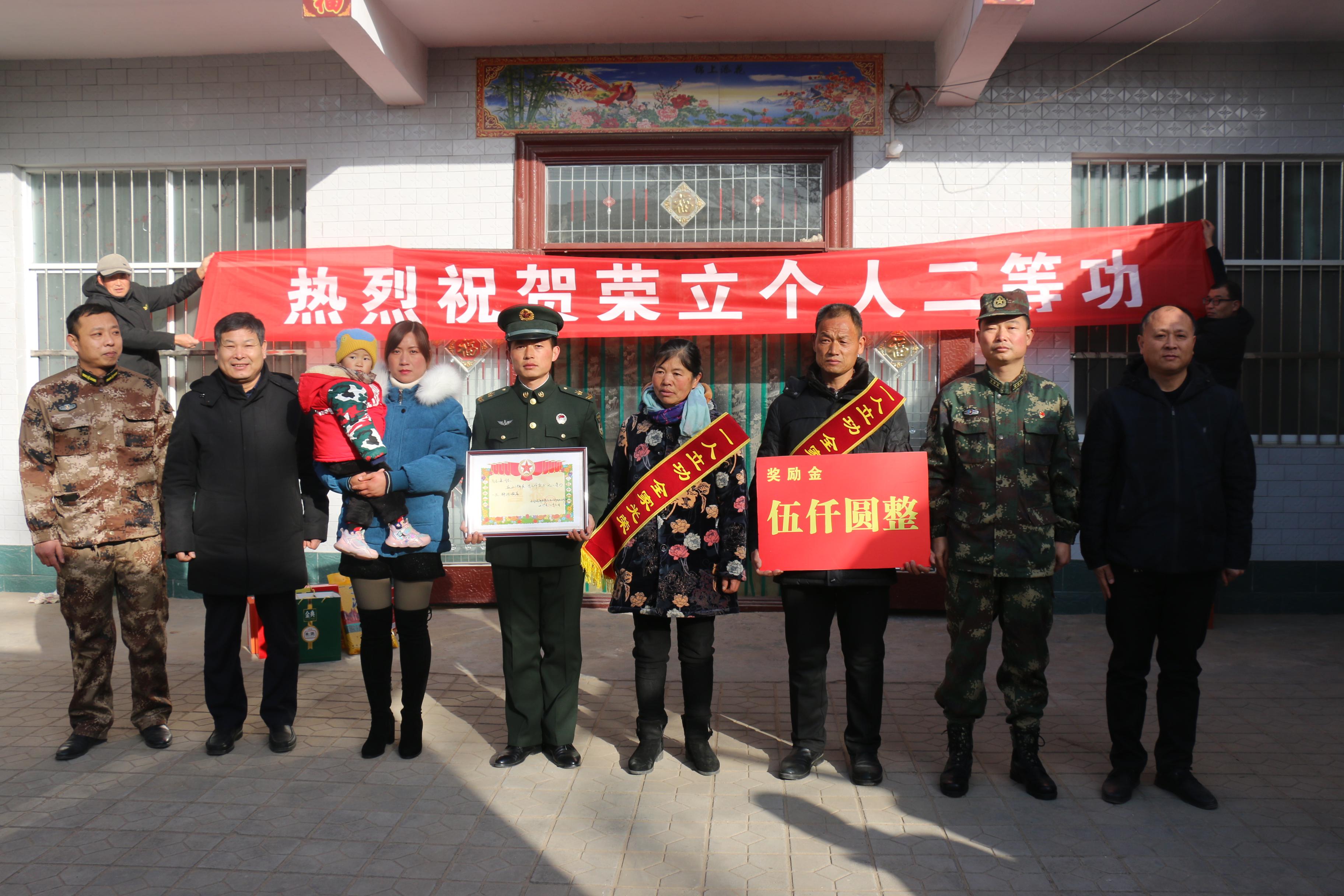 1月12日上午,西华县西华营镇双楼村某部士官高志豪家中锣鼓喧天,喜气洋洋。该县人武部政委涂友佳、县退役军人事务局局长龚坤敬一起把二等功喜报和“一人立功,全家光荣”的红色绶带及5000元现金等送到高志豪及其父母手中。