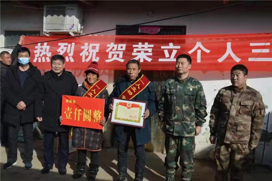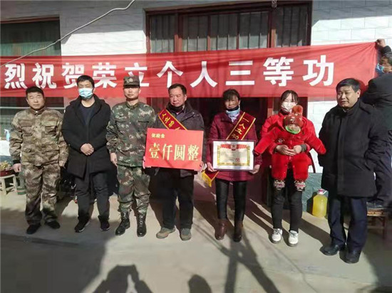 为广泛宣传立功现役军人先进事迹,大力营造“军爱民,民拥军,军民一家亲”的良好社会风尚,1月12日,西华县武装部政委涂友佳、县退役军人事务局局长龚坤敬等人一行,在东夏亭镇镇长庞友谊、镇武装部长王中原、退役军人服务站站长李俊奎等人的陪同下来看望慰问在部队荣立三等功的军人袁联盟、王俊亚家属,并为他们分别送上喜报、慰问品及慰问金1000元。