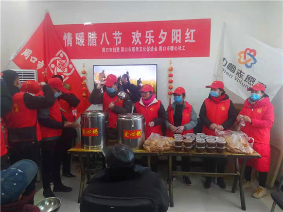 1月20日是腊八节,市妇联、市慈孝文化促进会的志愿者来到城乡一体化示范区搬口办事处敬老院开展“欢乐腊八节,情暖夕阳红”敬老慰问活动。志愿者把亲手熬制的八宝粥送到老人手中,给老人送去温暖。