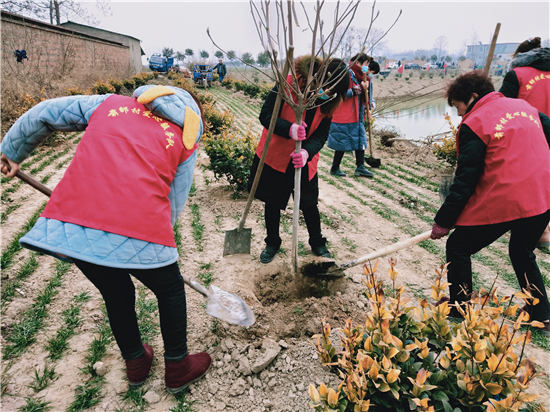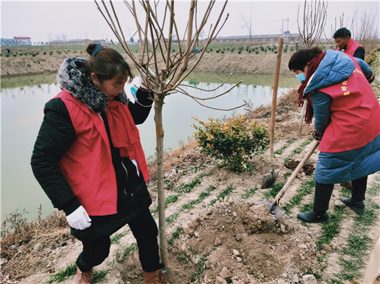 1月20日,西华县奉母镇前邵村的爱心服务队在水塘边种植红玉兰、红叶石楠等景观树,为建设中的亲子乐园搞景观绿化。为探索乡村振兴的新路子,前邵村整合100余亩闲置集体土地,组织本村村民大量种植,将村里几十套废旧的老房子改造成村史馆、农耕文化馆、民宿等,全力打造集乡村旅游、农耕体验、民宿经济、亲子游学教育基地等于一体的生态田园综合体,引领广大农户共同发展致富。
