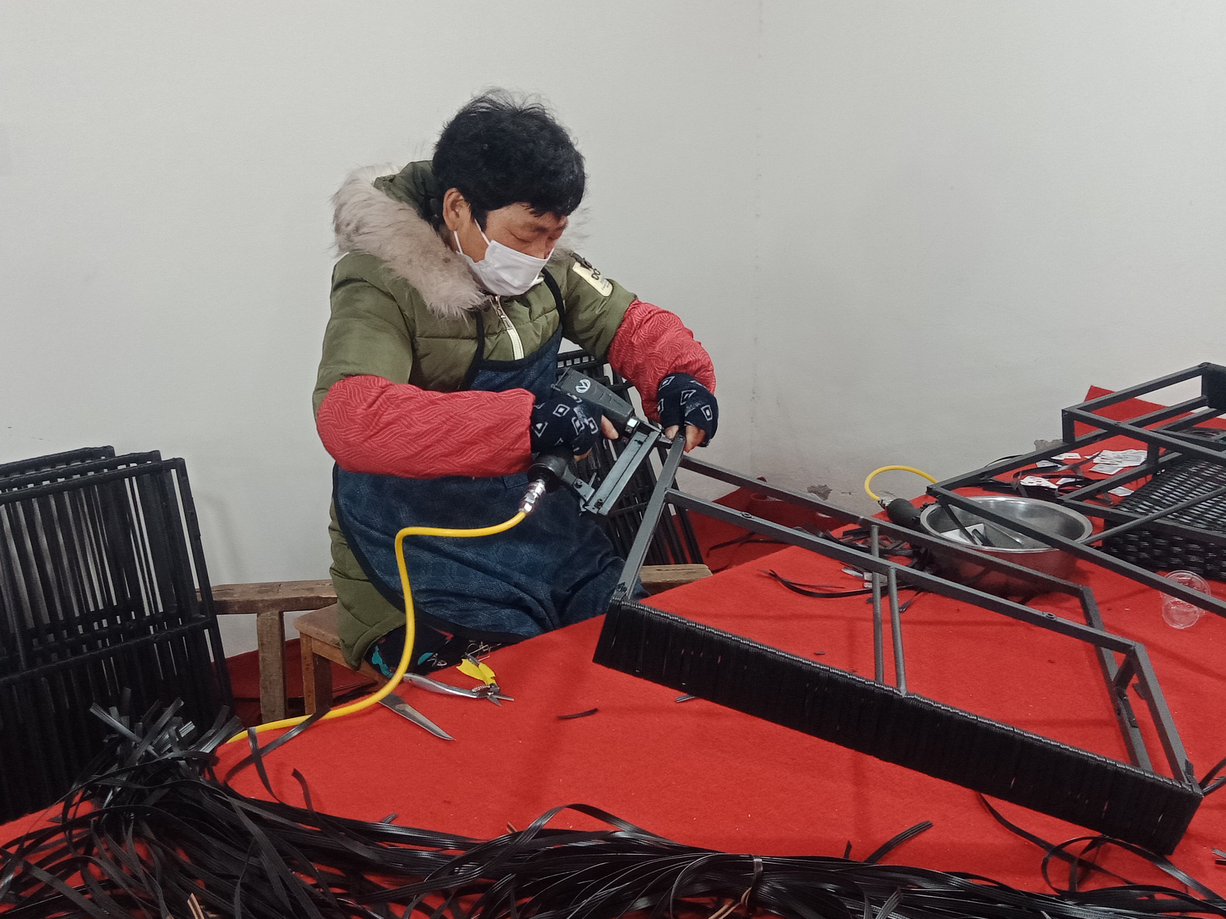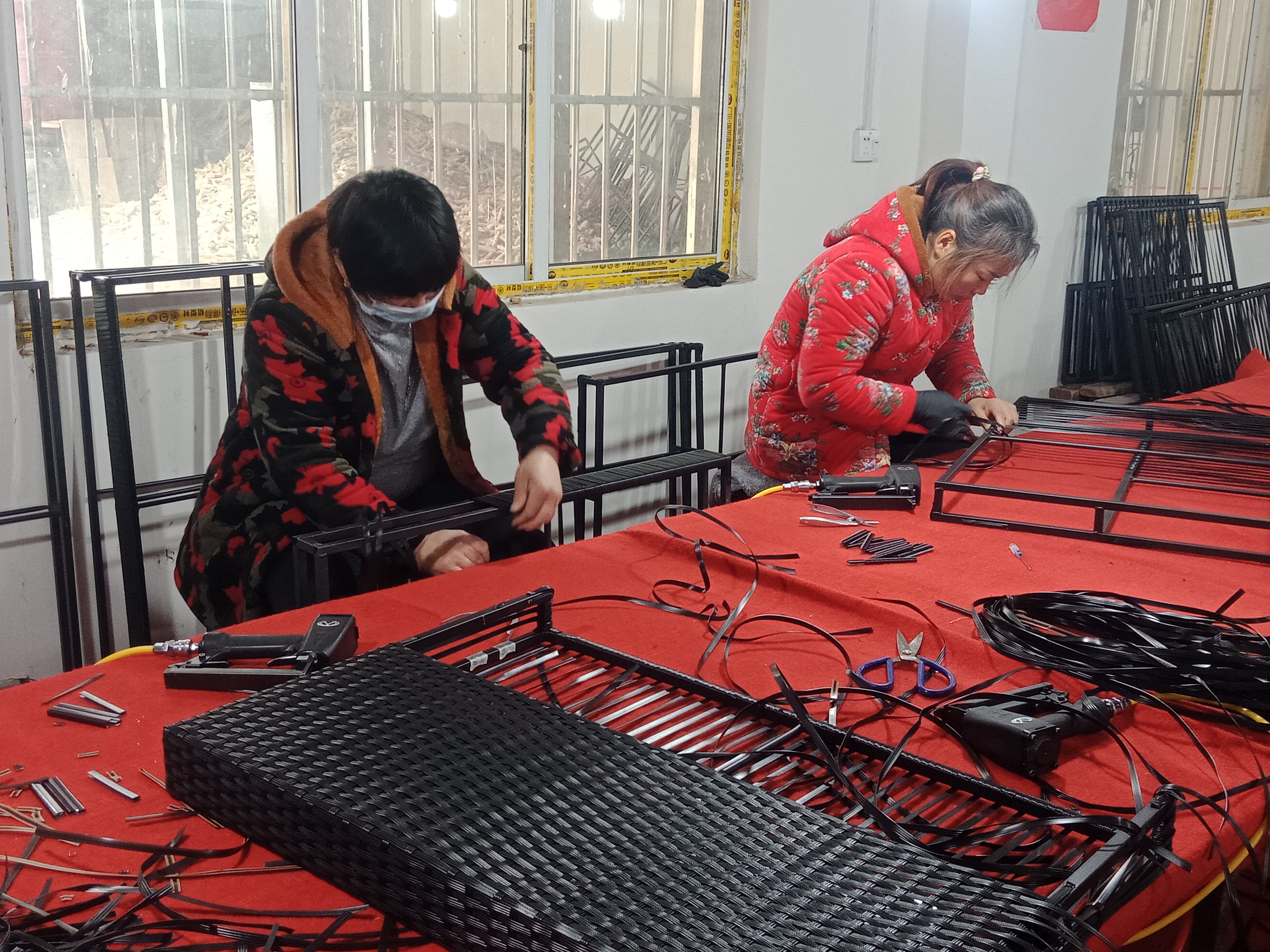 在加工车间,记者看到十几个中年妇女在不停忙碌着。有拉钢的、有编织的,有收尾的,显得很是轻松愉快。据说,熟练工每天可以加工十多个户外藤编沙发双面靠背,按件计算,平均每天能挣六七十元,多的可挣百元。