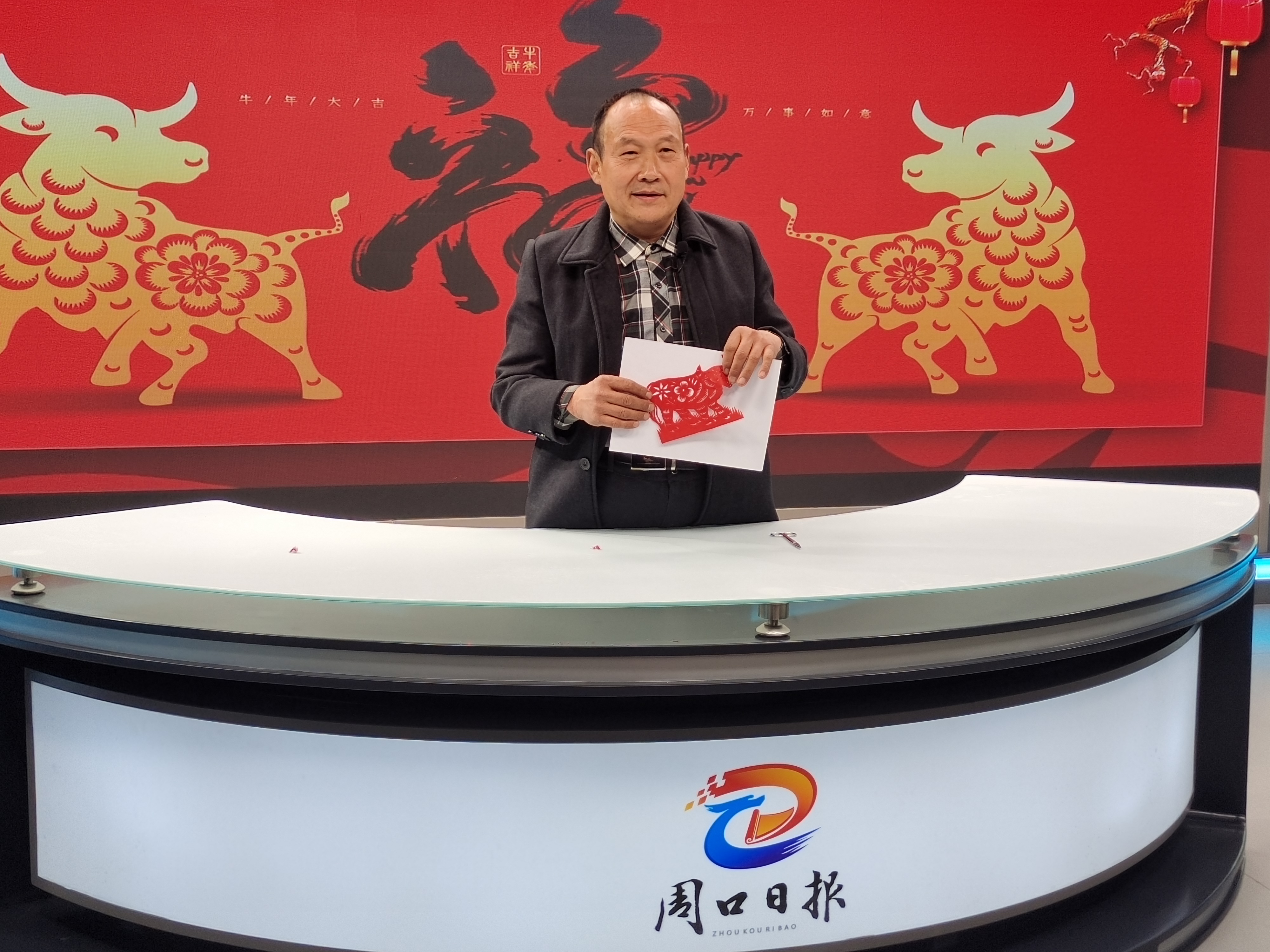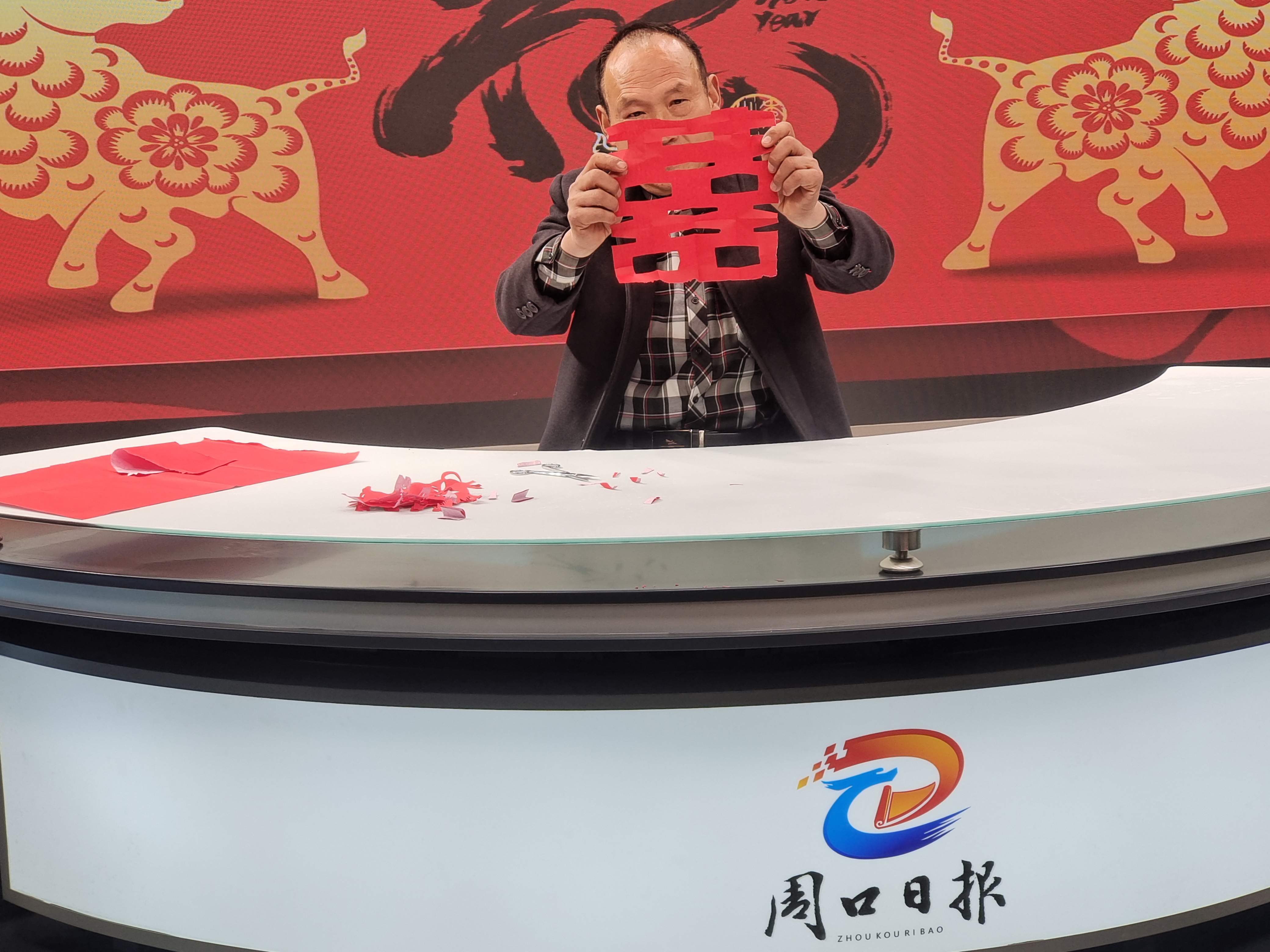一张正方形红纸,经多次对折后,两剪刀,剪出一个大红双“喜”字。1月29日,在周口日报融媒体演播室,河南省民间艺术学会会员,剪纸艺术委员会理事,“非遗”传承人王银生亮出“两剪子剪出一个红双喜”的绝活。