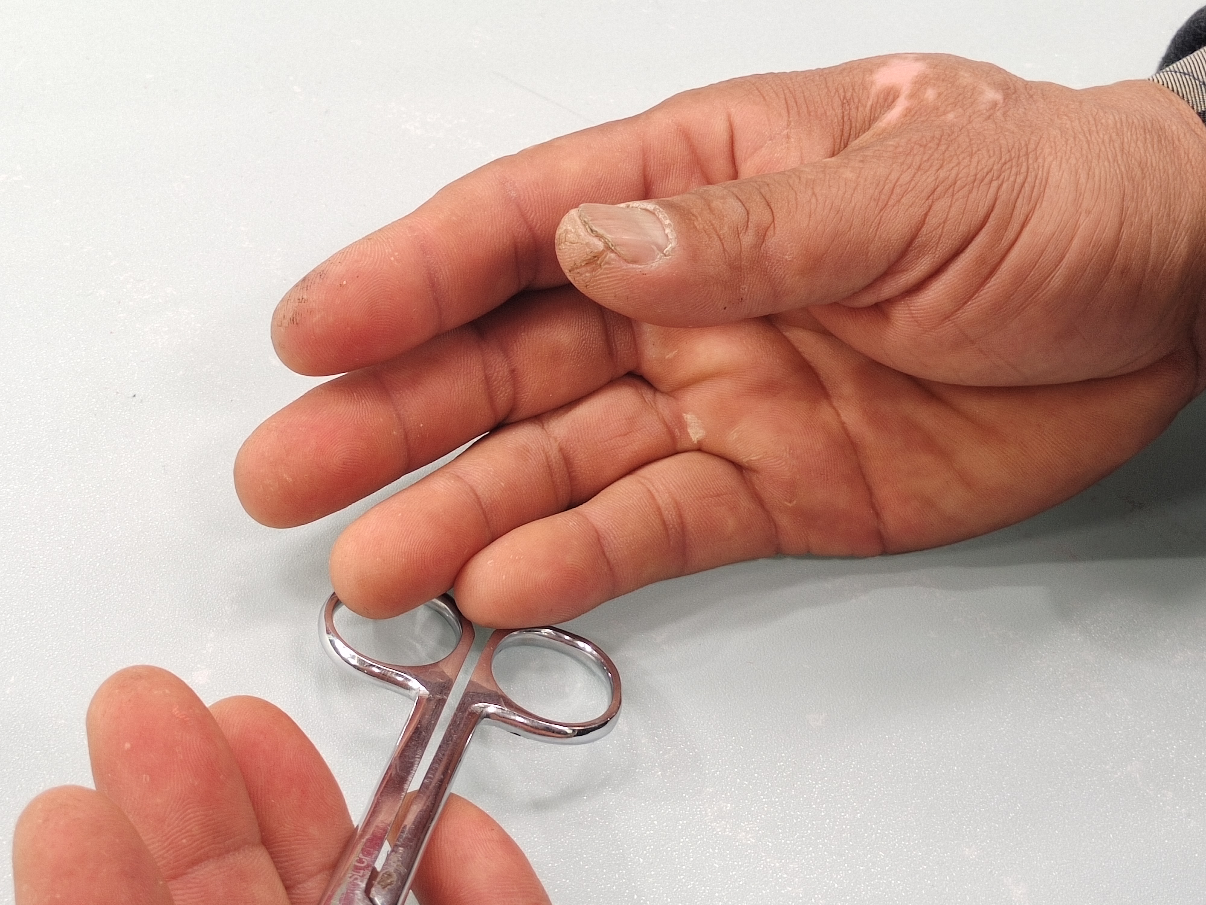 由于日复一日的练习,王银生手上长出厚厚的老茧,右手大拇指还有因拿剪刀留下的伤口。记者问他为何会把剪纸坚持50多年,他说:“因为我喜欢。”