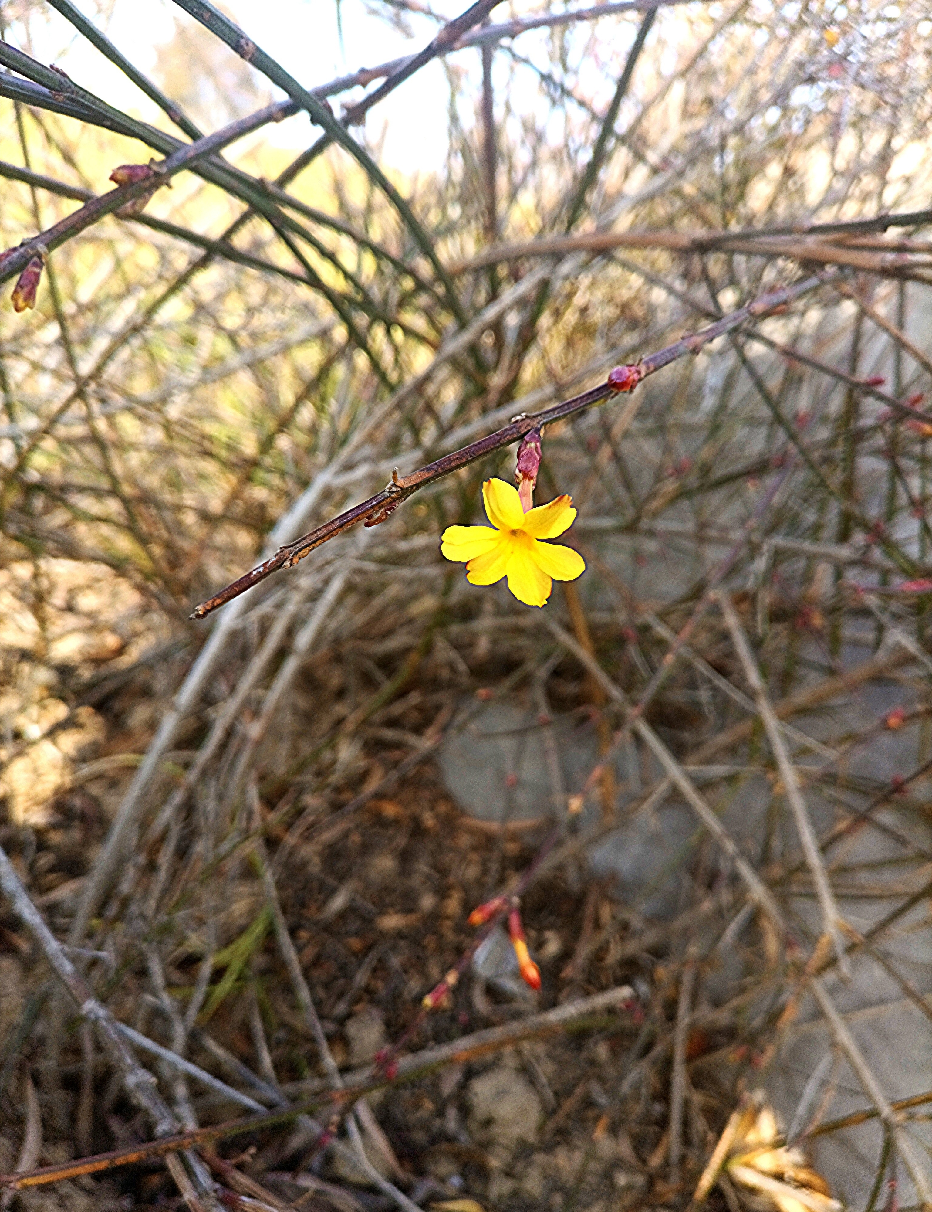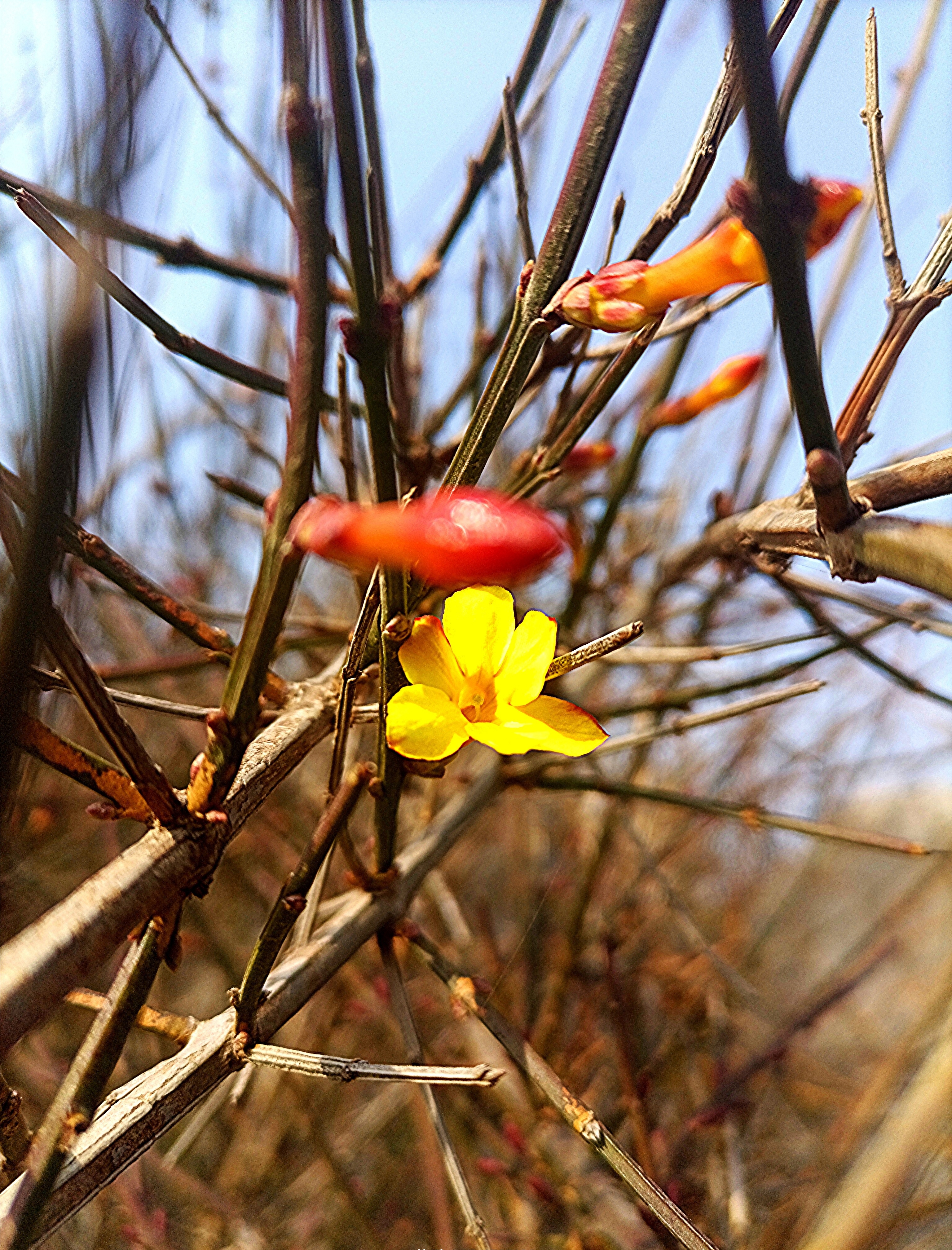 2月3日,是立春时节。接连几日,我市天气晴朗,气温渐暖,周口公园的迎春花枝条已经挂满了花蕾,偶有几朵“性急”的花儿已经绽放,迫不及待地迎接春天的到来,嫩黄的花瓣在阳光的照射下,闪耀出金子般的光芒,令人见之心喜。