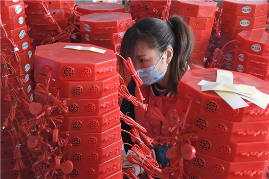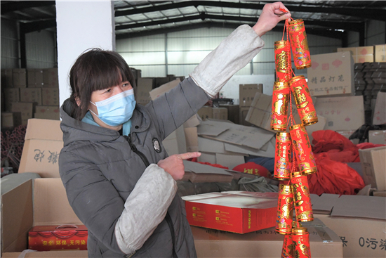 2月2日,在商水县魏集镇产业扶贫基地一帆工艺制作工厂,村民正在生产安全、环保、无污染的电子鞭炮。春节临近,不能燃放传统鞭炮的市民非常喜欢这种高科技替代产品,产品供不应求。③2