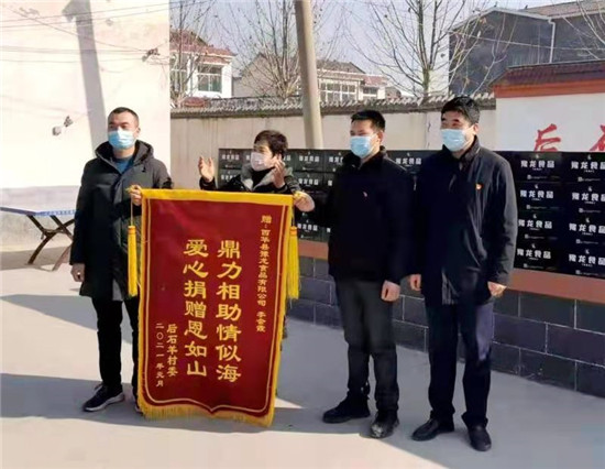 西华县黄桥乡个私协分会党支部书记、西华县豫龙食品有限公司负责人李会霞,带领该公司员工为黄桥乡敬老院、后石羊村、奉母镇七里仓二村乡村大食堂免费送去米、面、油、猪肉、水饺等慰问品。后石羊村党支部为其送去了“鼎力相助似海深、爱心捐赠恩如山”的锦旗以示感谢。