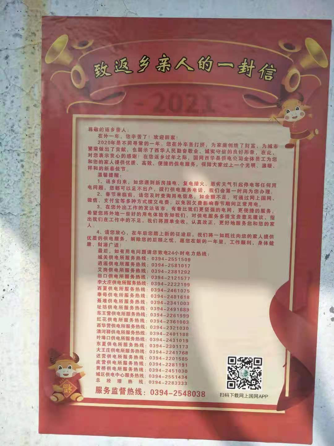 春节临近,外出打工人员开始陆续返乡。西华县供电公司以“情系返乡民工,电力温暖你我”为宗旨,积极部署,采取多项措施为返乡人员提供快捷、优质的服务,保障返乡民工能够度过一个平安、祥和的春节。